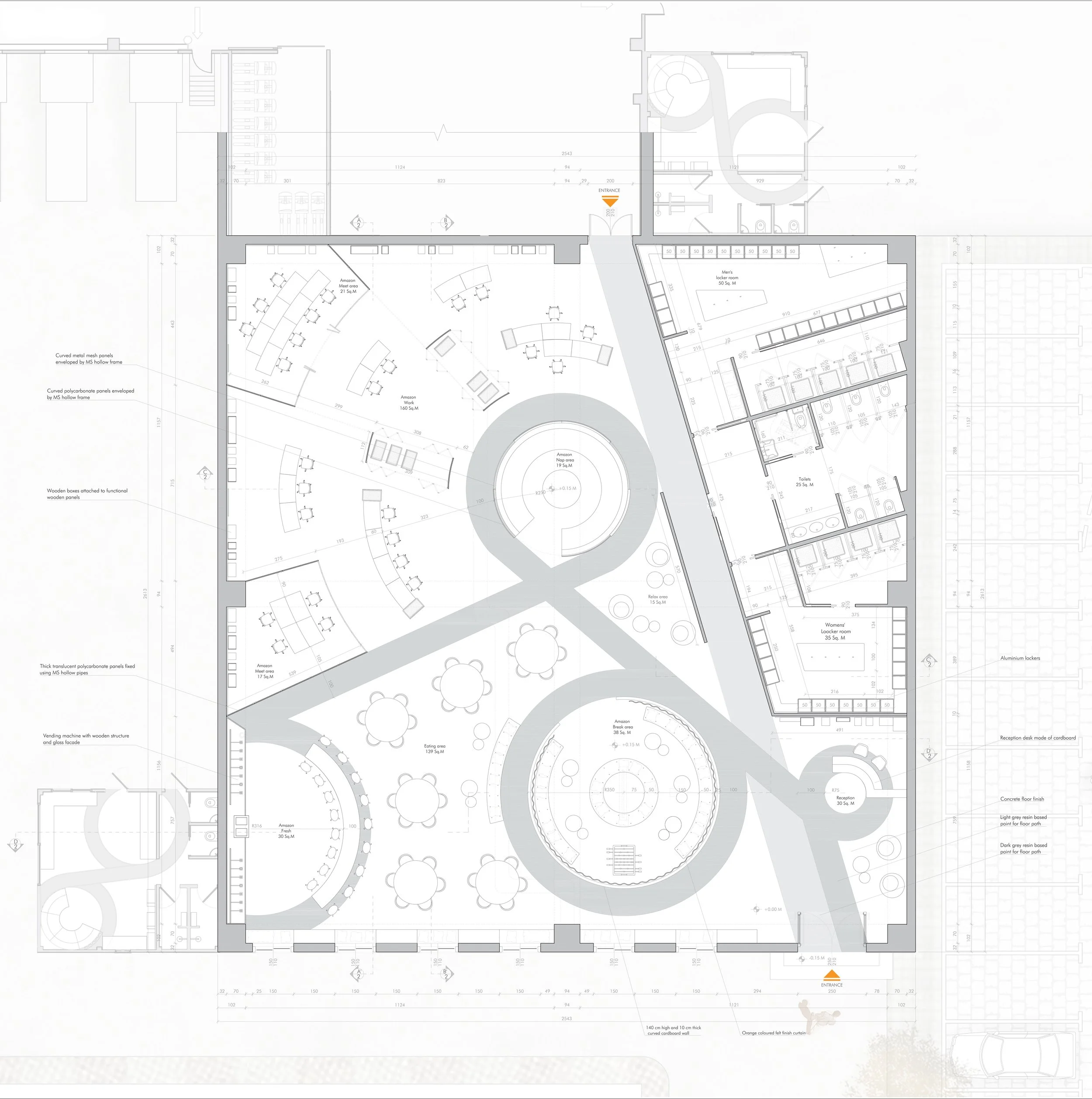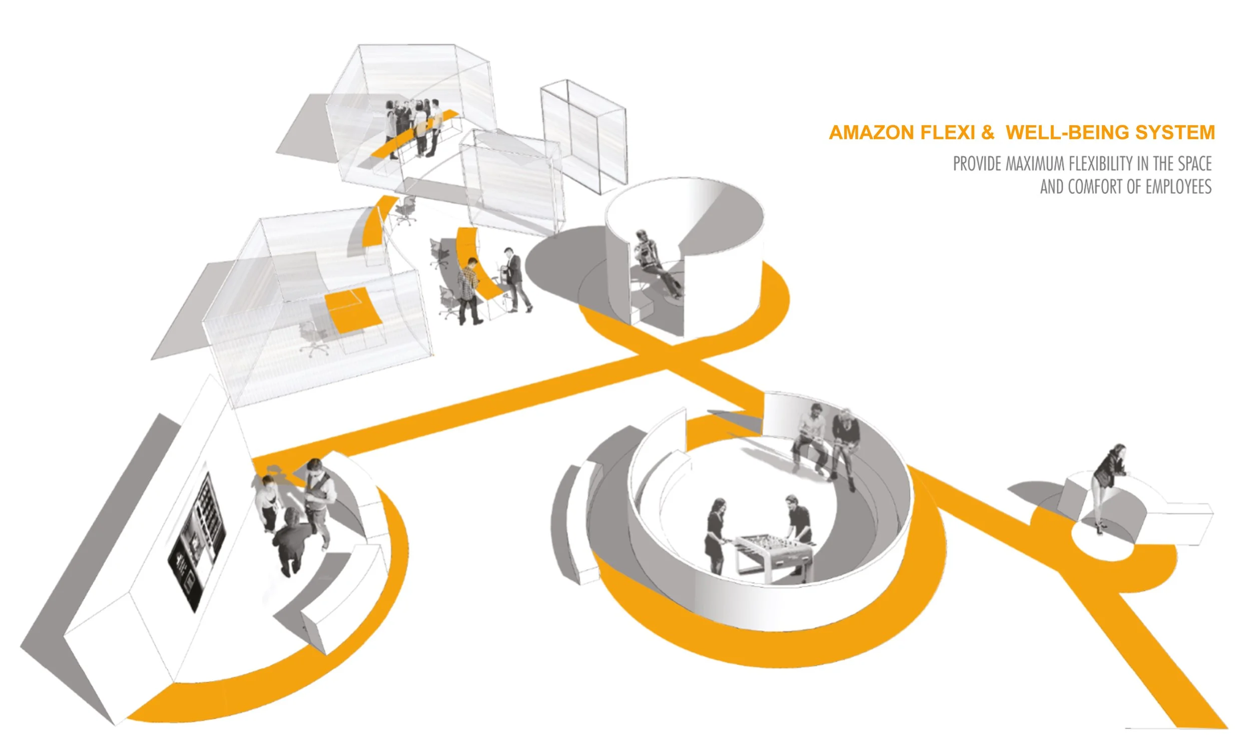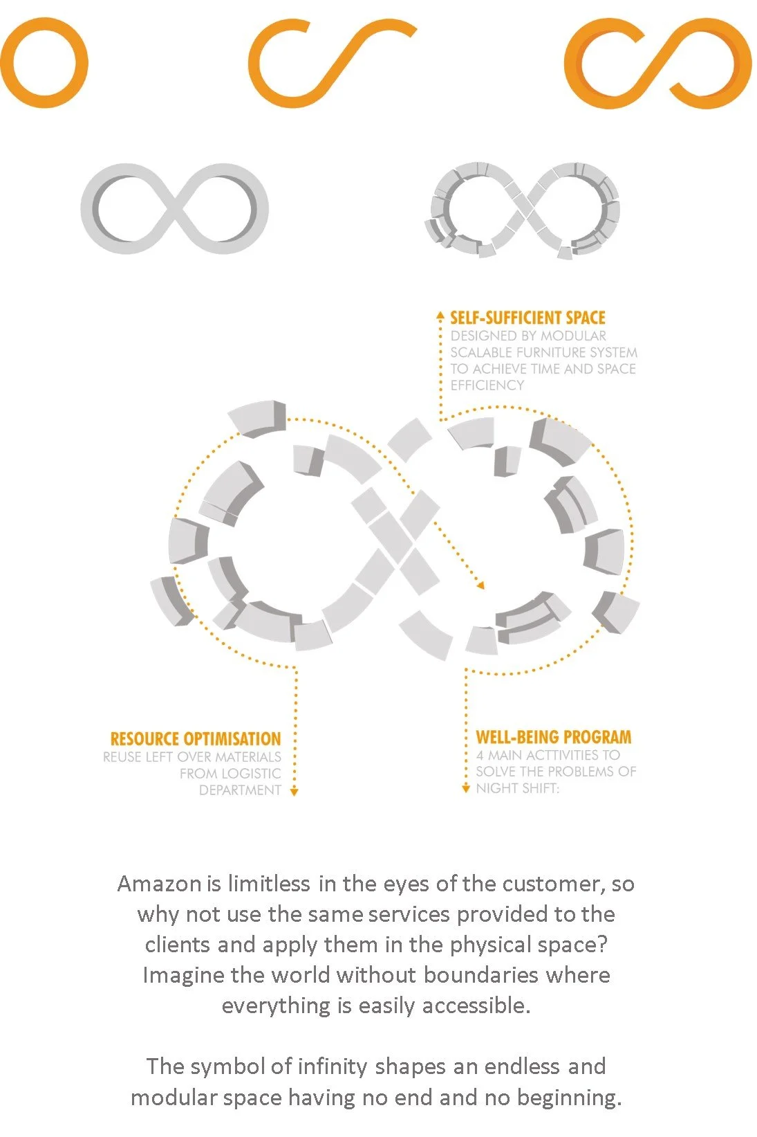 With a vision to transform what Amazon provides - unlimited experiences to people through a digital platform using simplicity and personalisation as the main tools, into a physical experience, a limitless space is visualized through an infinity symbol which binds all the existing areas together, creating an environment that is fluid and contains unlimited possibilities, indicating that the space has no start or end.