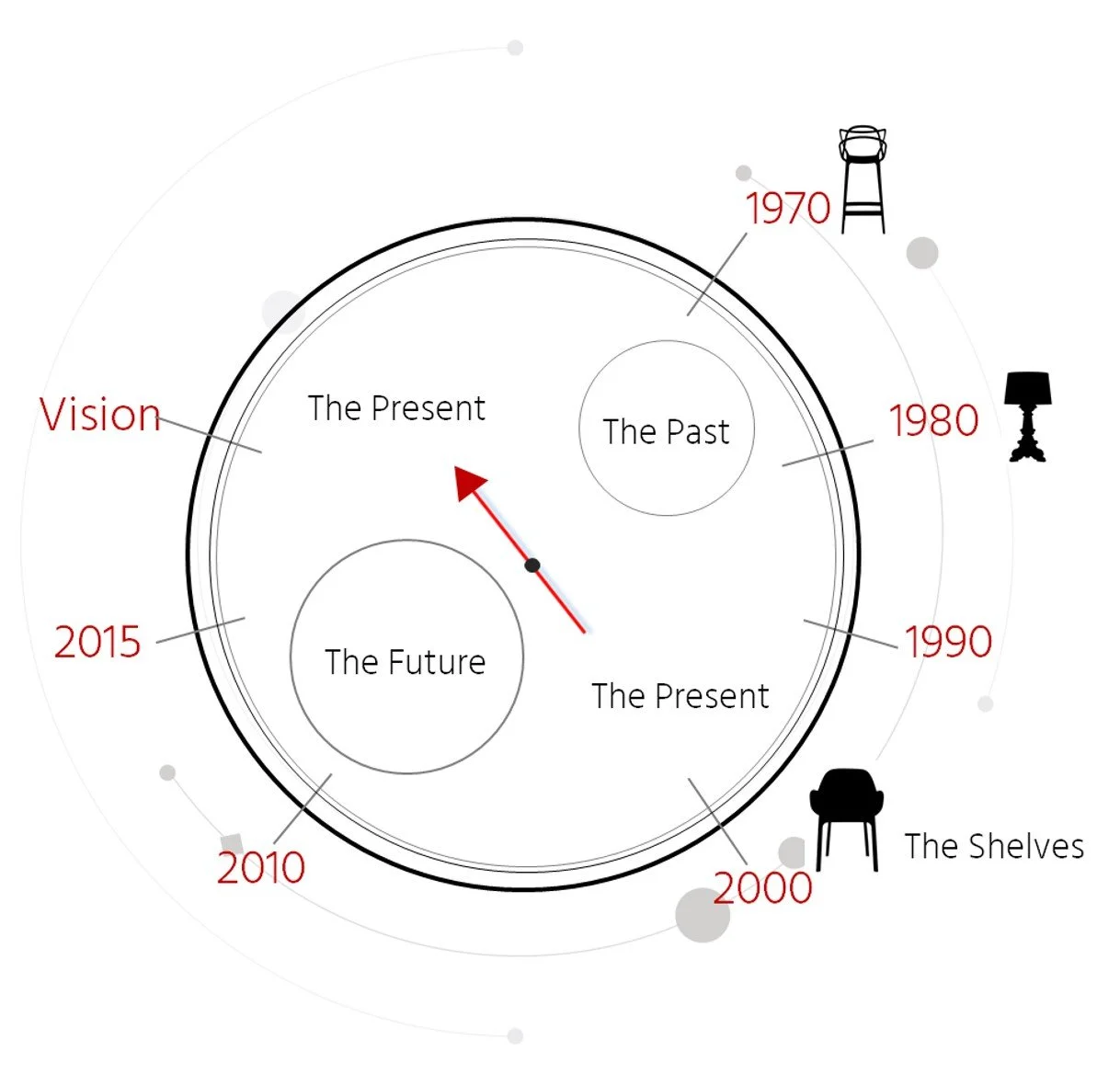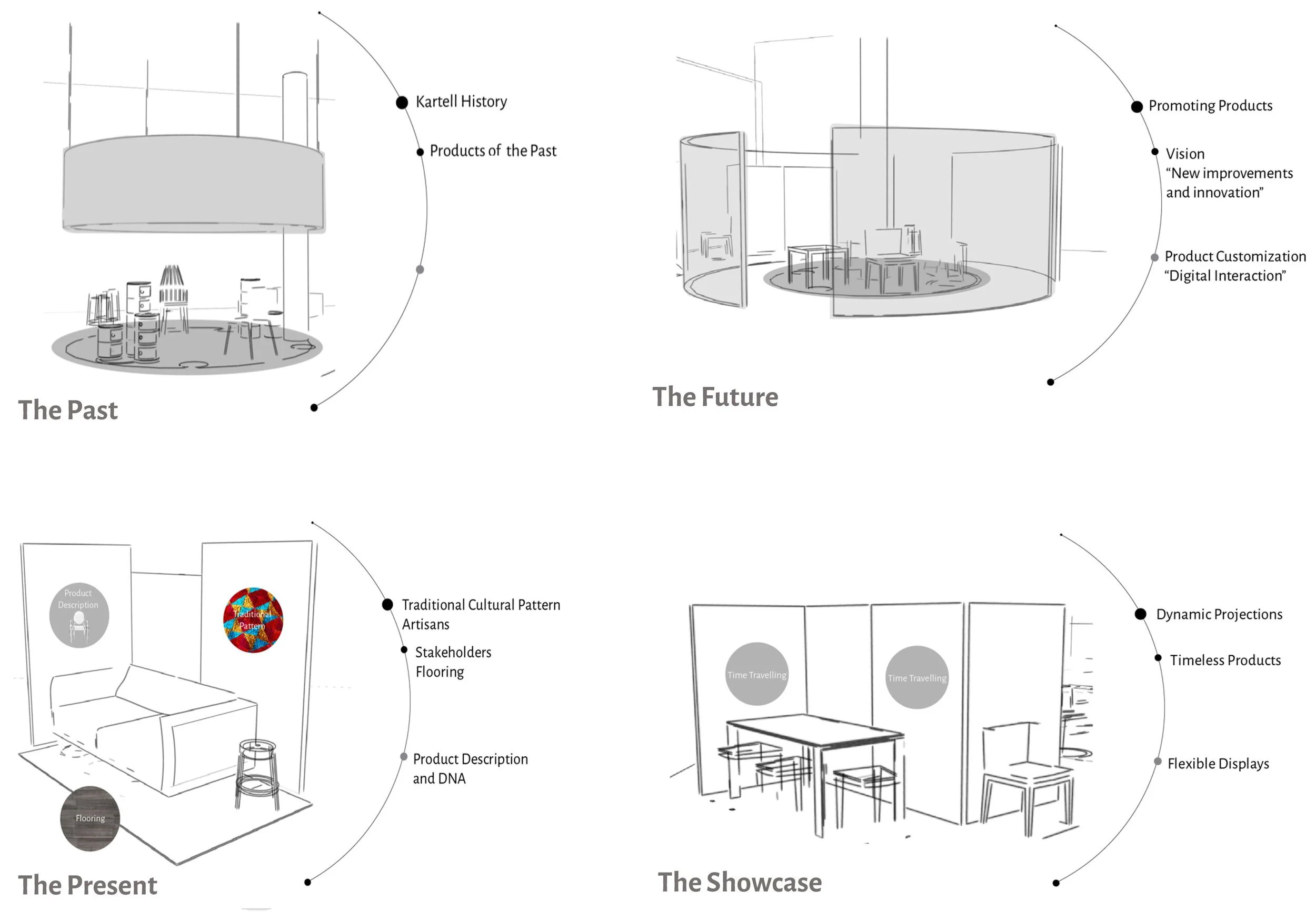 The space is divided into four parts according to time lapses. The past provides an emotional experience to the customers, the future is a vision, yet to come, informing the users of the things in store for them. The present is a platform, weaving the past and the future together, and giving a chance to the customers to live and experience the products. The fourth time lapse, the showcase or shop window, allows the customer to travel to different eras of time from across the world alongside Kartell products.